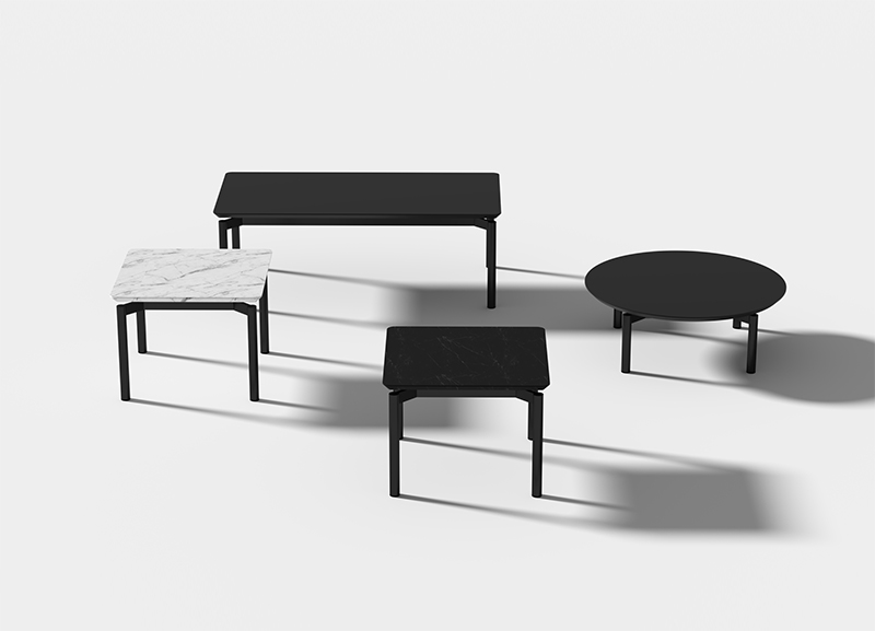米洛茶几作为米洛沙发的系列产品,沿用了其独特的脚架形式;在极简、百搭的理念下,搭配黑白石纹的岩板台面,形成了极具有漂浮感和建筑感的几何外形。