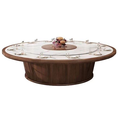 片尺寸价格说明定做服务。这款酒店新中式16人电动餐桌采用高质量的木材和大理石台面制造,实木表面涂装采用了中国传统的漆艺技术,使其具有较好的耐用性和美观性。电动餐桌采用先进的电动机和智能控制系统,可以实现快速、平稳的转动调节,满足不同场合的使用需求。