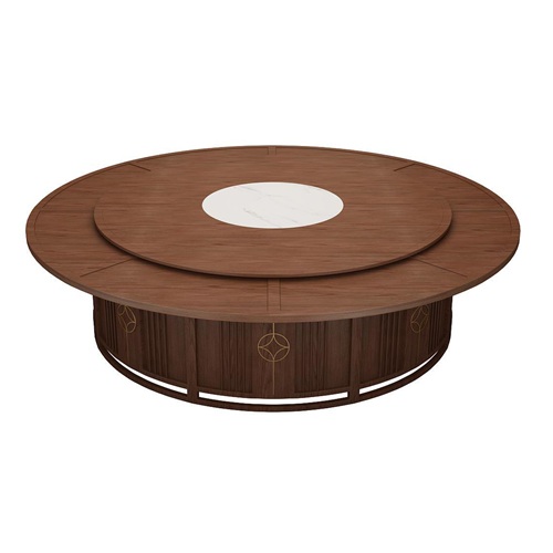 。这款宴会餐厅新中式实木20人转盘电动餐桌是由经典的胡桃色实木与白色大理石搭配。转盘是白色的大理石,桌面是胡桃色的实木,这样看起来电动餐桌上下更加呼应,底座采用很前卫的竖行格栅,并且在桌面可以电动遥控旋转,让电动餐桌功能更加丰富,就餐者有更好的就餐体验。