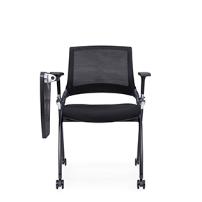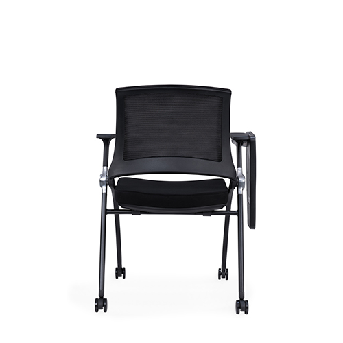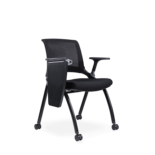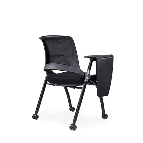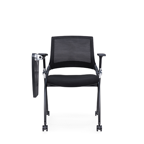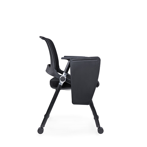 黑色喷涂椅架,后背铝合金活动铸件连接,实心钢筋支撑座板,带铝合金活动链接件,座板可翻转,铝合金支架写字板,内含水杯架写字板面