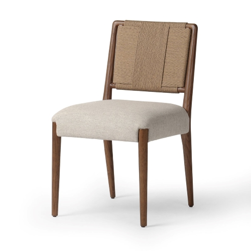 餐厅家具厂家为您展示咖啡厅软包座垫麻绳靠背实木餐椅